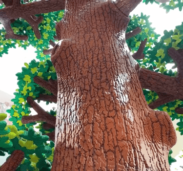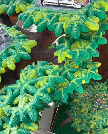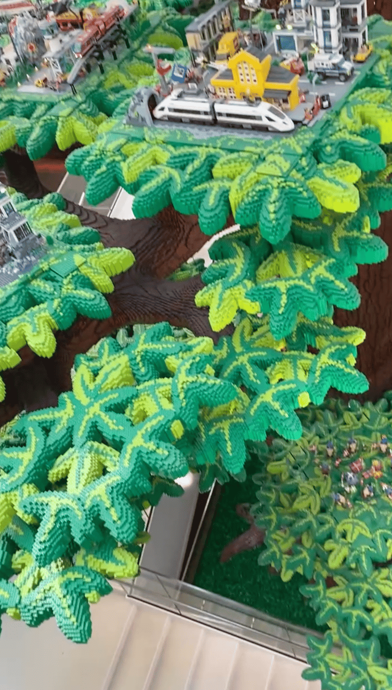 It’s breathtaking in person. The kids stood frozen for a second, just staring at the details — birds, ladders, tiny builders — everything made from LEGO.