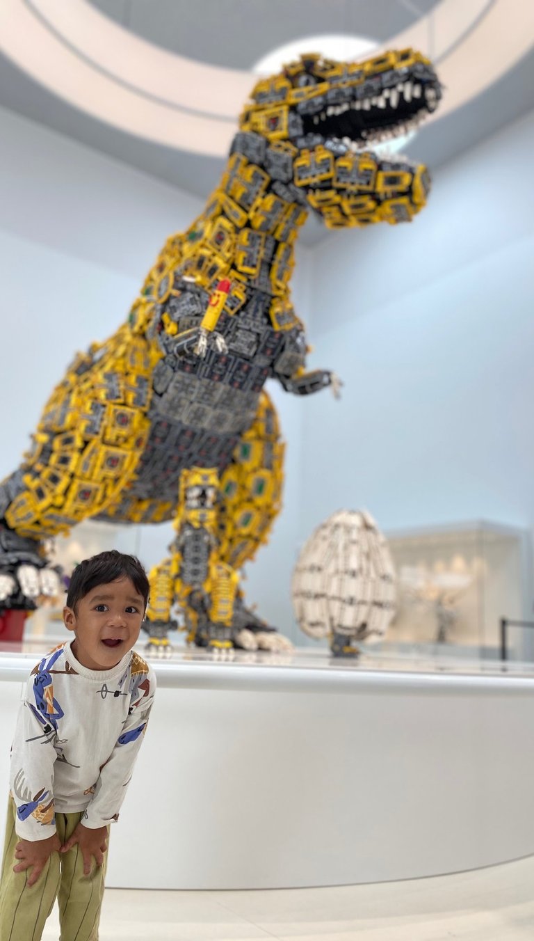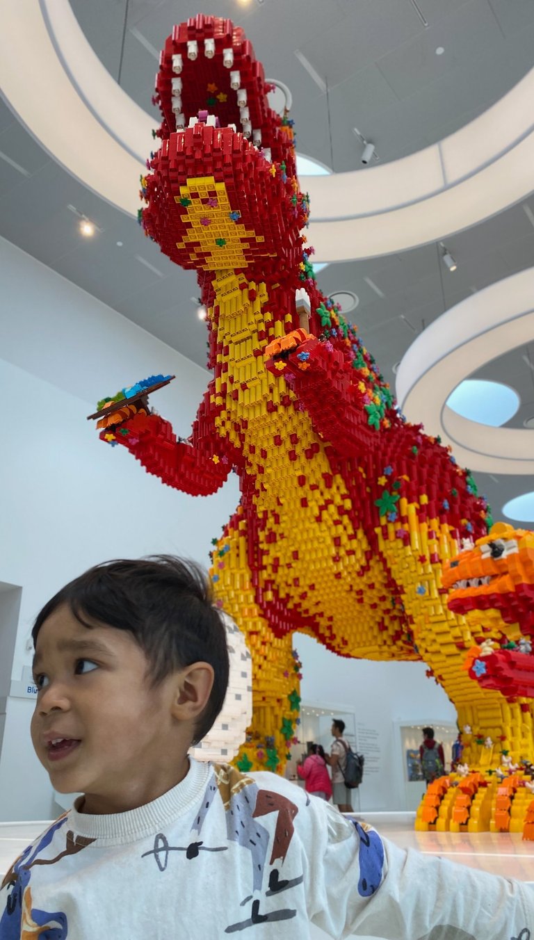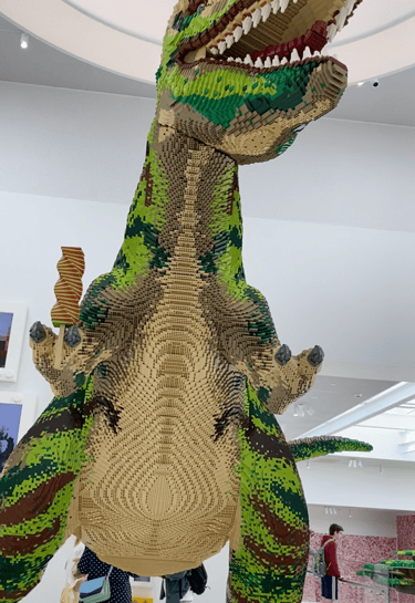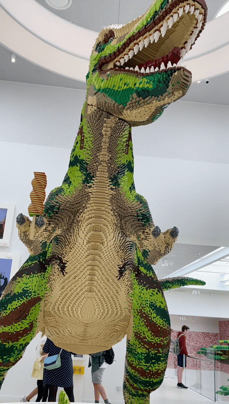 As we made our way upstairs, we were immediately greeted by three enormous LEGO dinosaurs — one red, one green, one yellow — each built entirely from LEGO bricks.