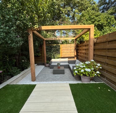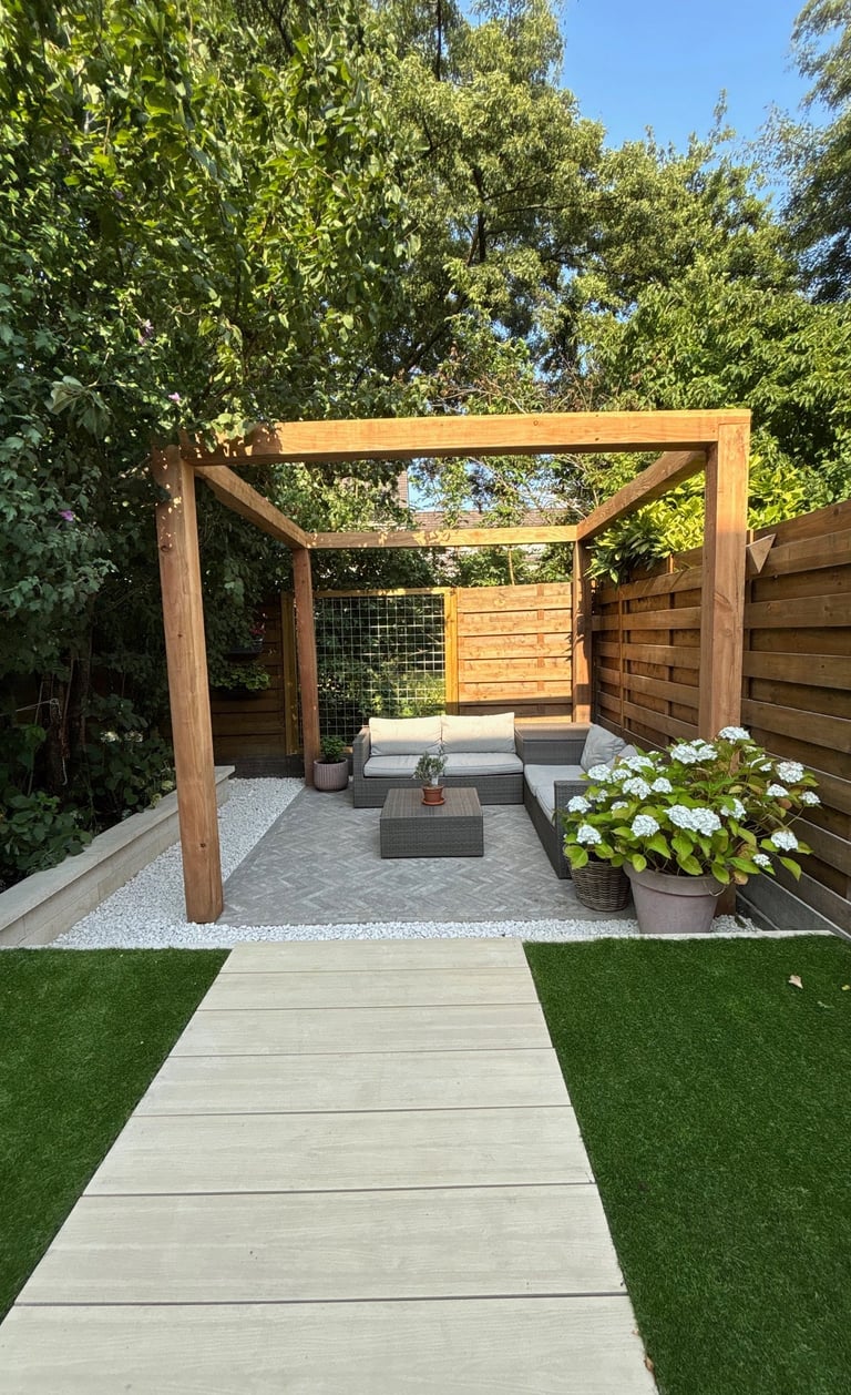 I was dreaming of large pavers, bricks, and a pergola. My husband leaned more toward composite wood. Both visions helped us shape the design.