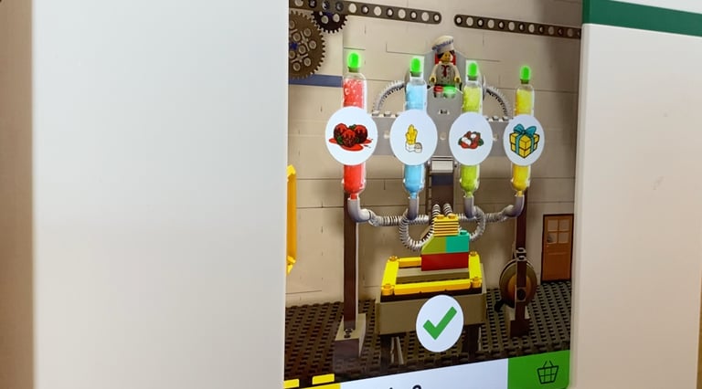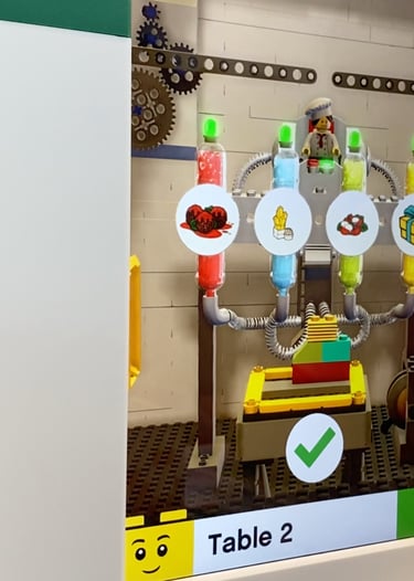 Each table gets a LEGO plate with colored bricks. These bricks represent different food items (for example, red for chicken, yellow for fries, blue for veggies).